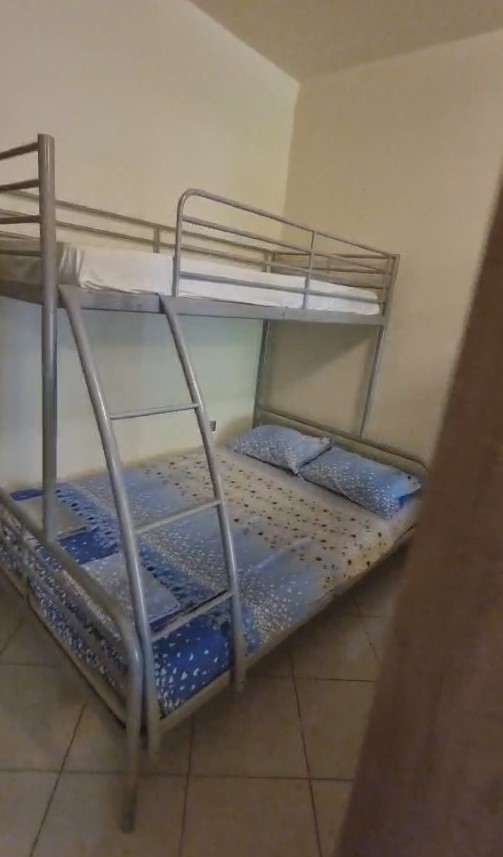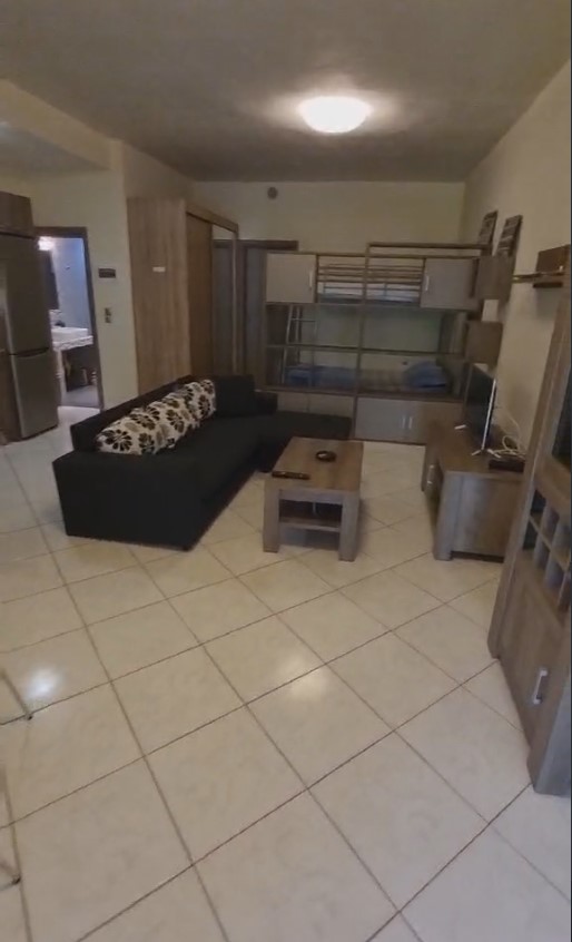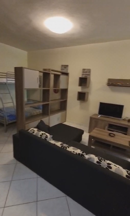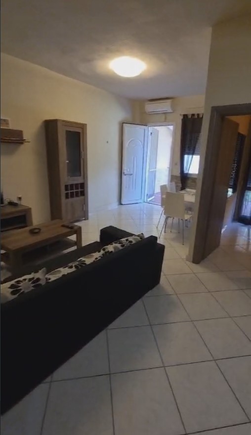 1/5 апартман – една спални соба, дневна голема со кујна комплет опремена, единечен кревет на спрат + француски лежај.