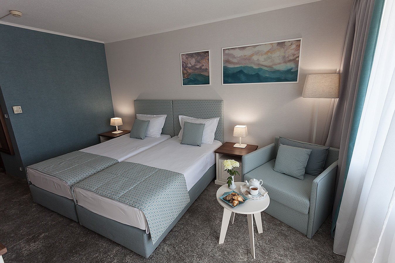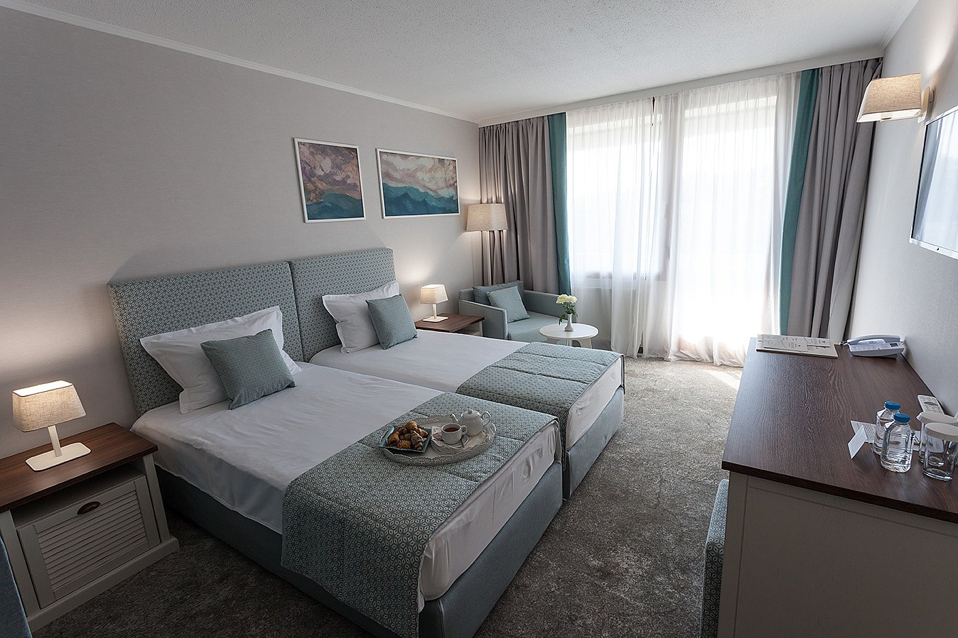 | Двокреветна соба (разделени легла) | 1 возрасен | 2 возрасни +1 дете до 3.99г |