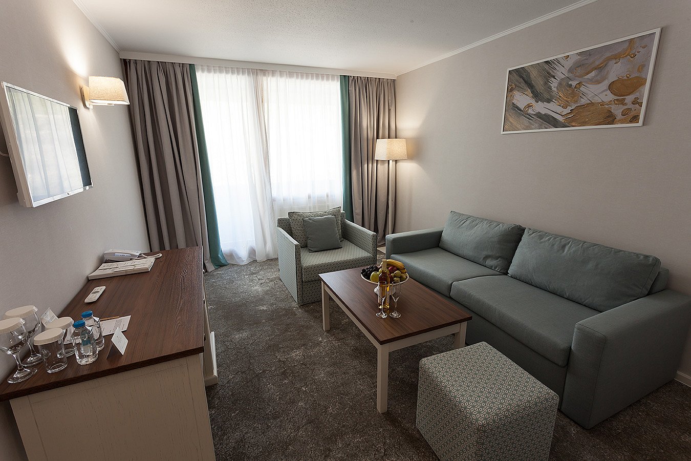 кабловска телевизија, безжичен интернет, телефон, минибар (со доплата), бањите се со специјална тоалетна козметика, балкун со поглед на градот, планината, базенот, паркингот или паркот.