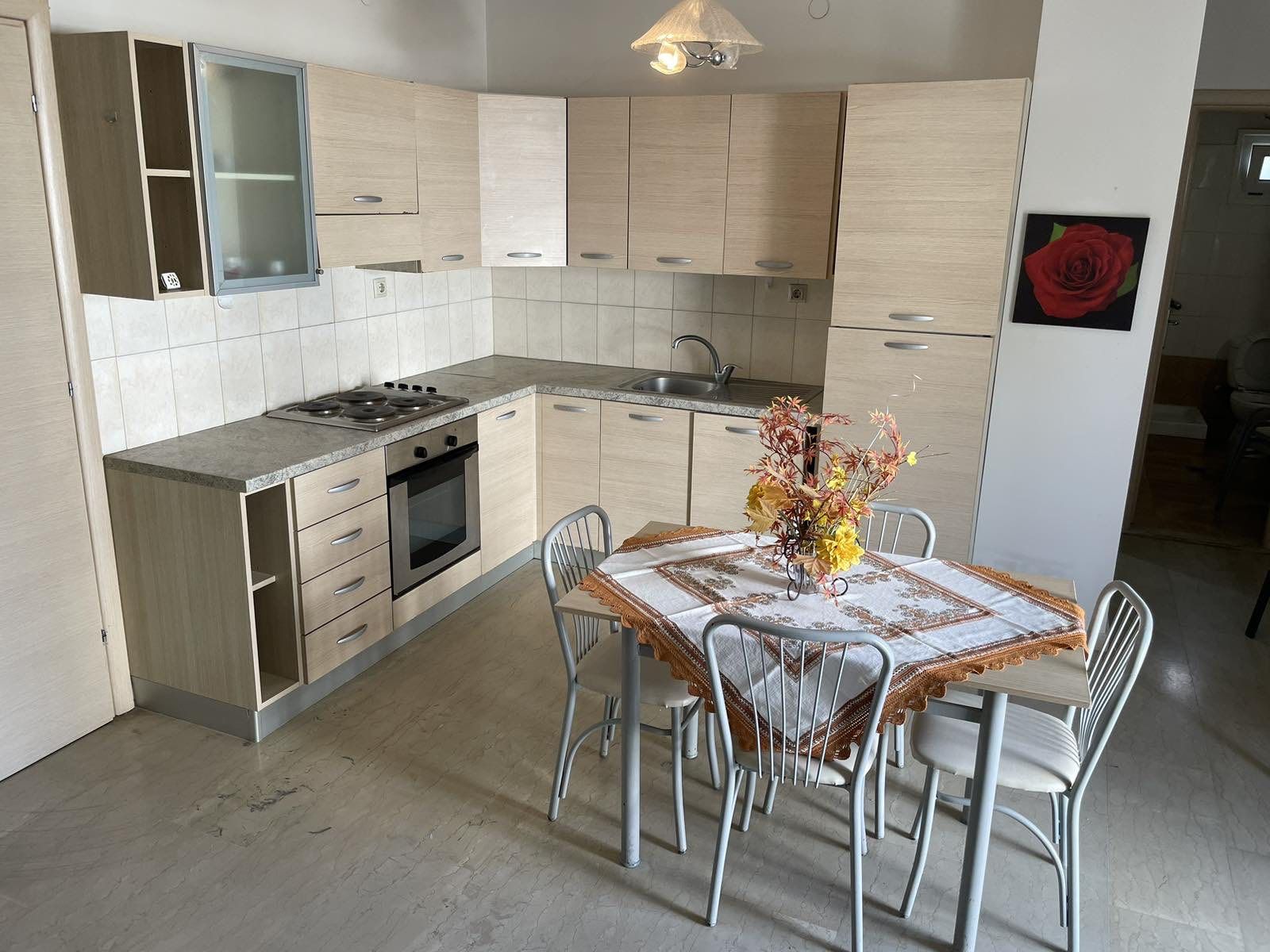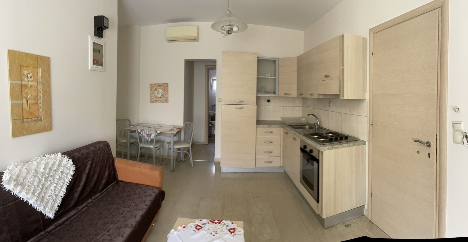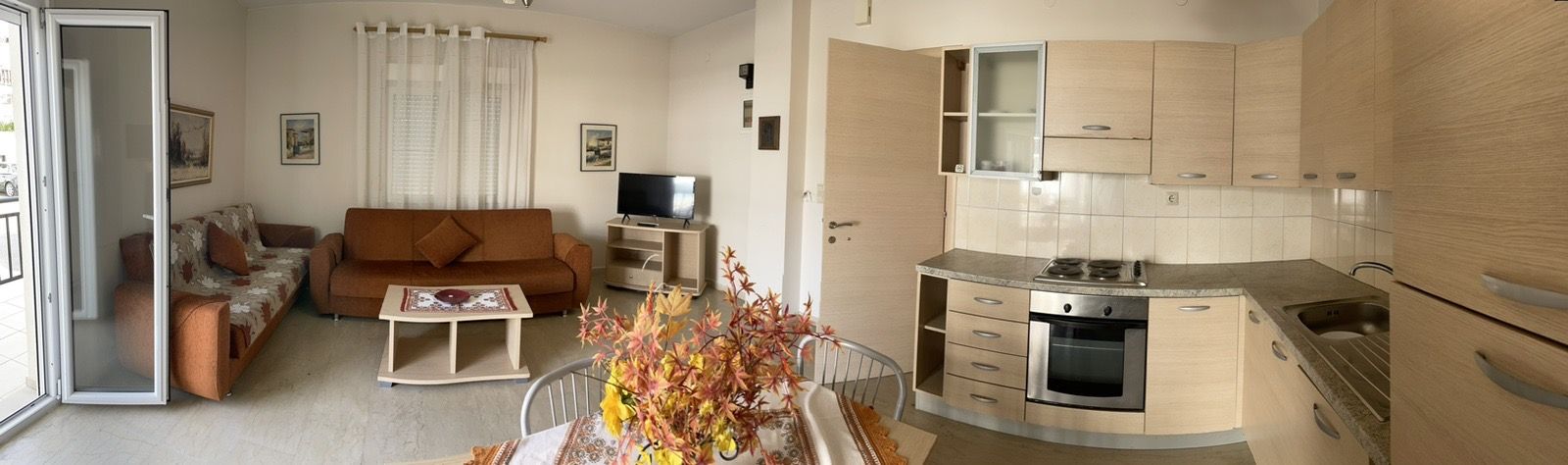 Апартман бр. 1 (1/4+2) – 4 лица + 2 – високо приземје. Простран апартман со брачен кревет во спална соба, две софи на извлекување во дневна соба споена со кујна. Кујната е комплетно опремена со голем електричен шпорет со рерна, голем фрижидер, маса со столови, клима уред и телевизор.Апартманот има сопствен тоалет со туш. Од кујна се излегува на тераса со страничен поглед море и истата еопремена со маса и столови.