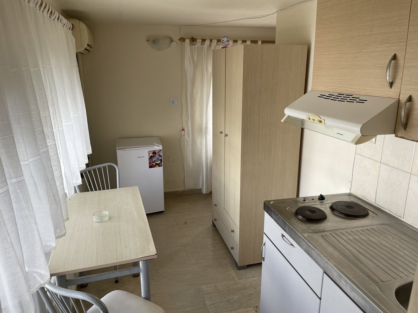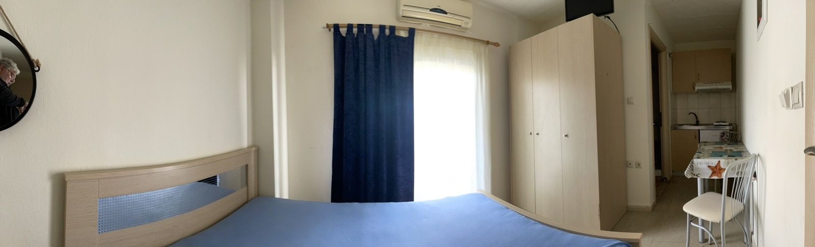 Студиоброј6 (1/2)– високо приземје.Студиото располага со еден брачен кревет и мала комплетно опремена кујна (кујнски инвентар, решо и мал фрижидер), клима уред, ТВ и сопствен тоалет со туш. Од студиото се излегува во сопствено дворче кое располага со маса и столови.