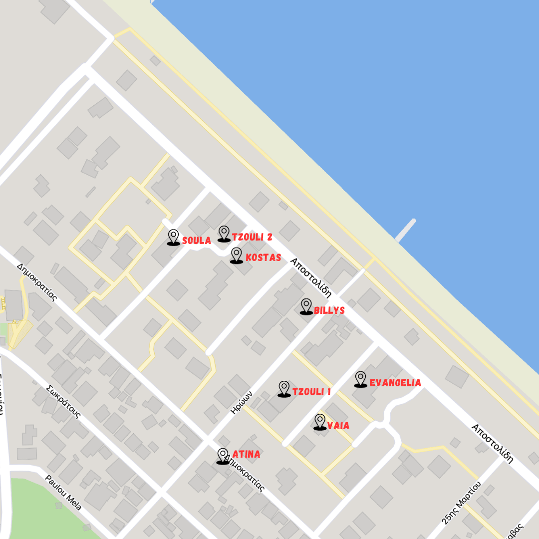 Куќа “Soula” се наоѓа на одлична место положба, на само50 метри од прекрасната песочна плажа. Куќата располага со четири студија и два апартмани. Користење на клима уред и интернет (wi-fi) се вклучени во цената. Вилата има сопствен уреден двор и паркинг веднаш пред вилата.