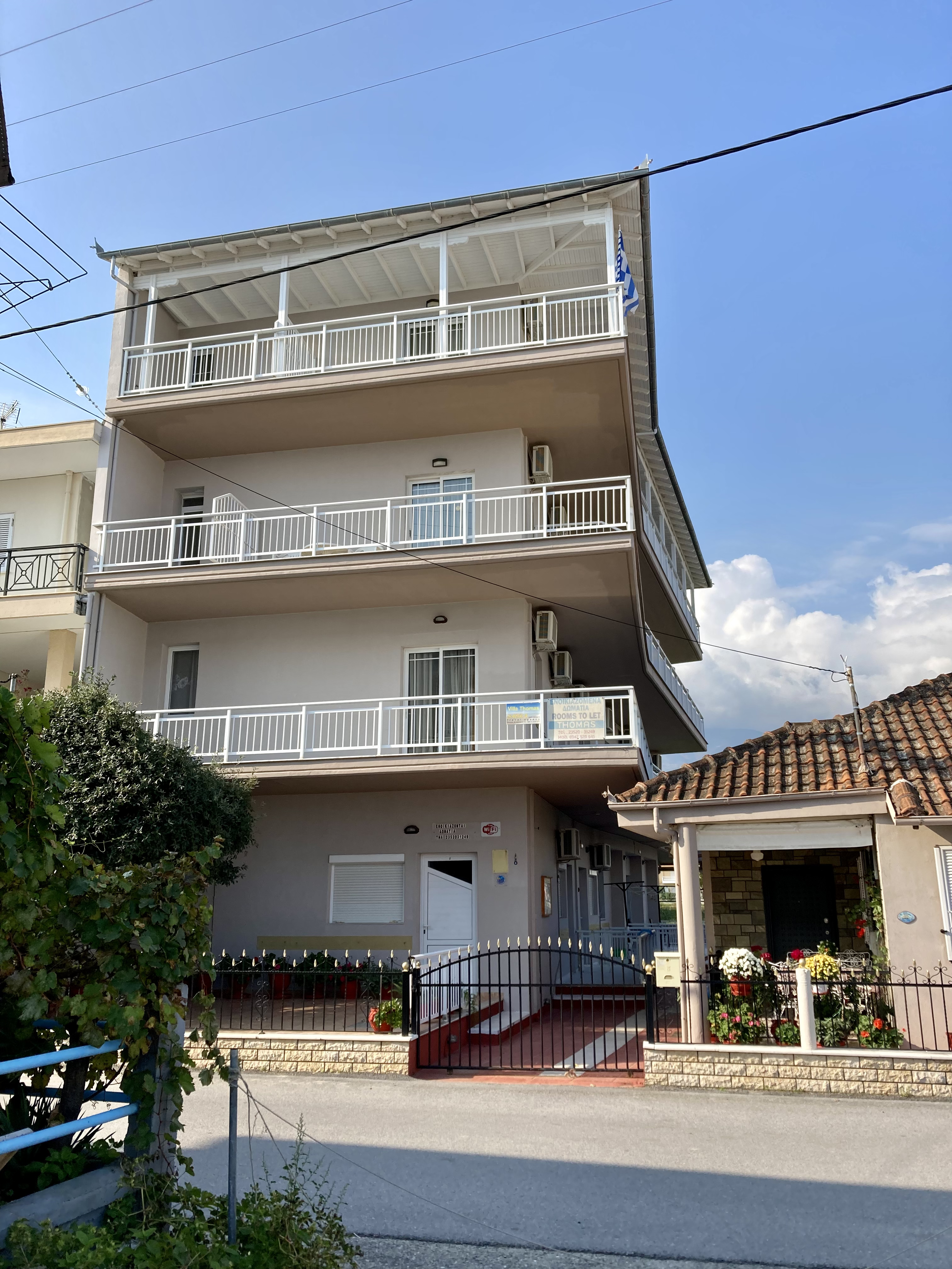 Вила THOMAS „B“ категорија – се наоѓа на десната страна од местото, на 100 м. од главната улица, и САМО 5 м. од прекрасната песочна плажа. Секоја соба е опремена со модерно опремена кујна, ТВЦ, ТВ, тераса (сите со страничен поглед на море) и КЛИМА (со доплата – 6 € на ден).