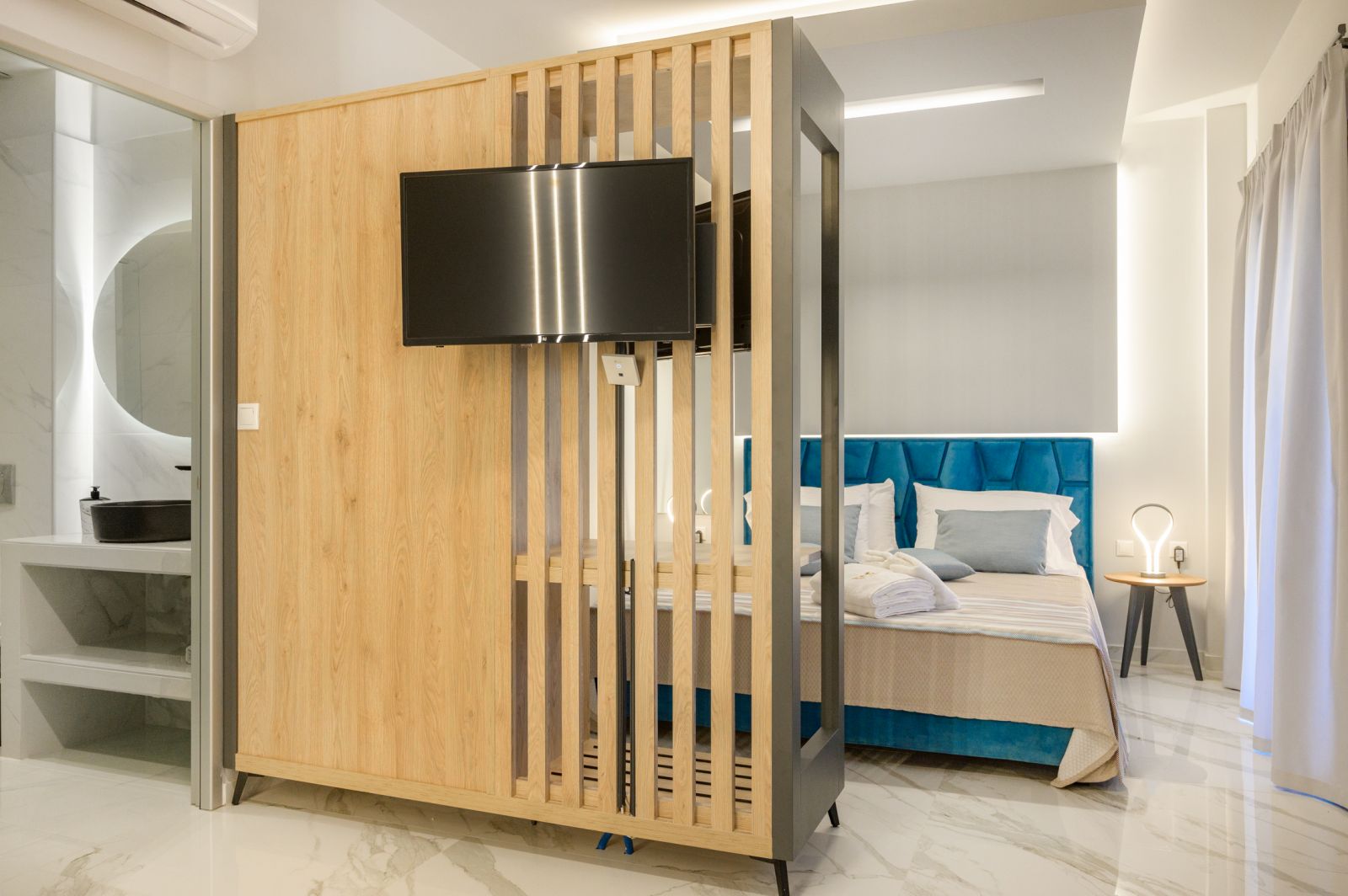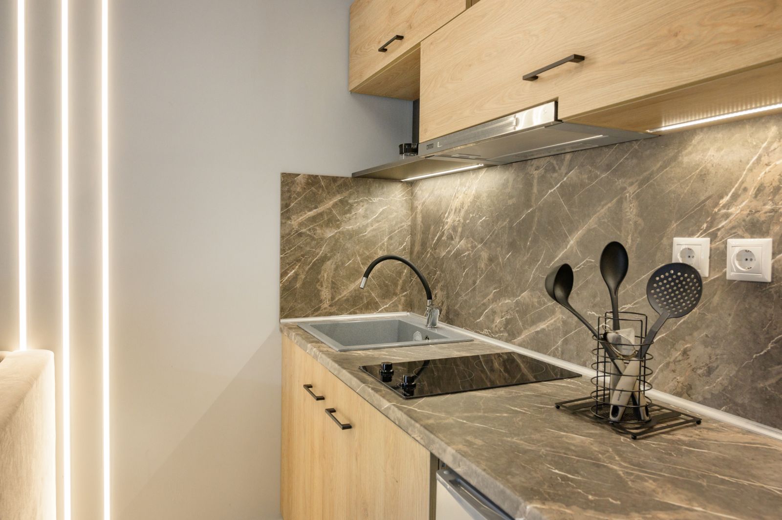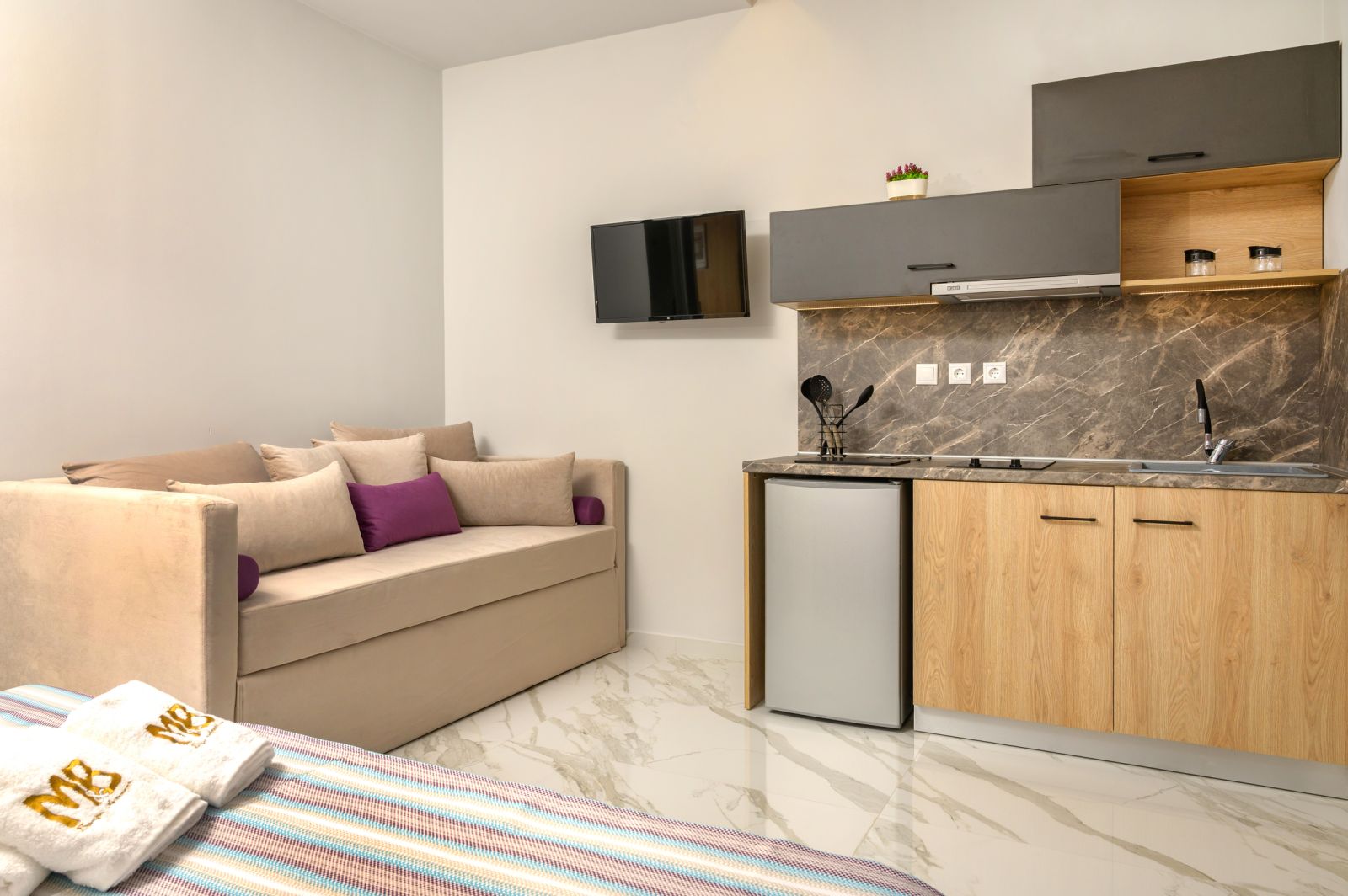 Студио бр.1 – располага со голем брачен кревет и софа која не се пушта. Во ова студио може да се сместат максимум 2 возрасни лица и 2 деца до 10 години или 3 возрасни лица.